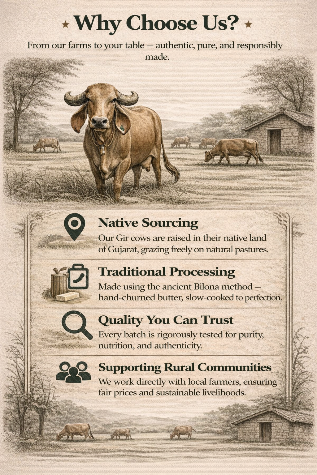 Every batch undergoes rigorous quality testing. We maintain cold chain logistics, use traditional production methods, and source milk only from ethically-raised Gir cows. Each product is certified and tested for purity.